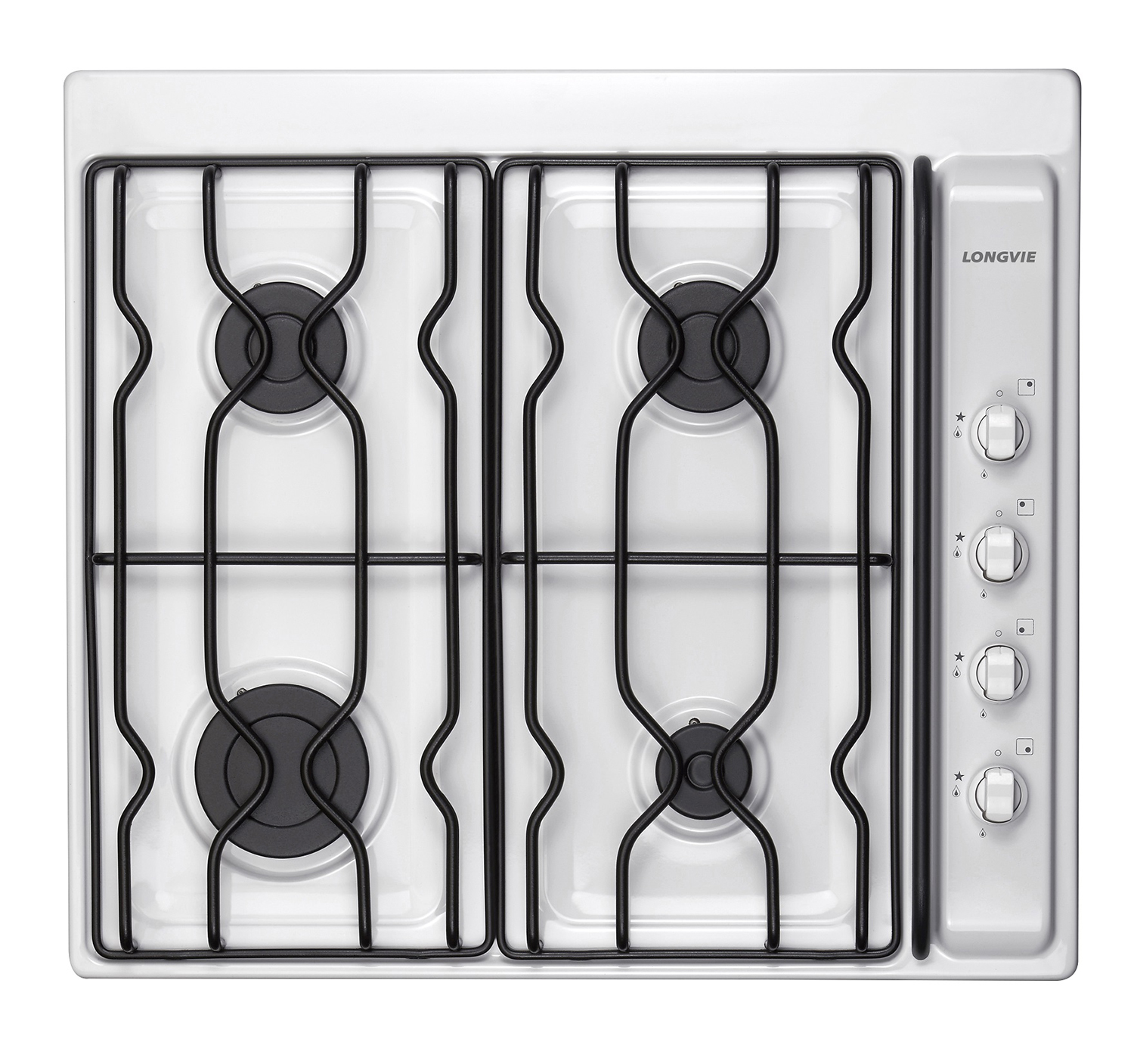 El anafe a gas Longvie A2600BF posee un diseño en color blanco, es encastrable y posee rejas de varilla de hierro enlozado.